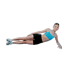 Primul exercitiu: intinsa pe partea stanga, cu mana stanga sub umar si palma pe podea; picioarele sunt asezate unul peste celalalt. Incordez abdomenul si ma ridic astfel incat sa ma sprijin pe palma si pe picioare, in timp ce corpul ramane in pozitia dreapta. Raman in pozitia"suspendat" pana numar la trei, apoi cobor. Trei serii a cate zece repetari, apoi repet miscarea pentru partea dreapta a corpului.